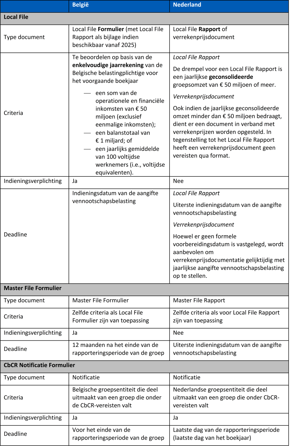 Naar aanleiding van de update van de Belgische verrekenprijsformulieren lijkt het ons opportuun om de vergelijking te maken met Nederlandse verplichtingen in verband met verrekenprijzen. Onderstaande tabel geeft een overzicht van verschillende aspecten in verband met verrekenprijsverplichtingen: